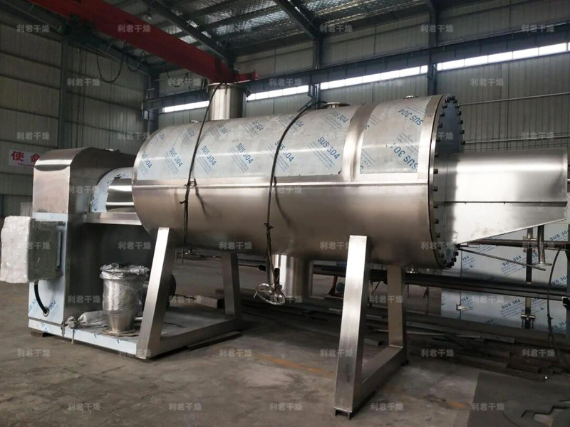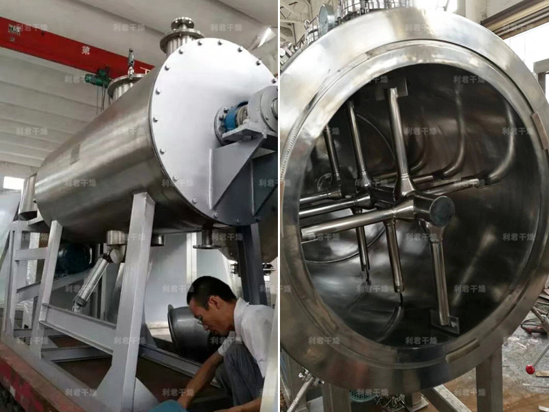本機(jī)是一種新穎臥式間歇式真空干燥設(shè)備,濕物料經(jīng)傳導(dǎo)蒸發(fā),帶有刮板攪拌器不斷清除熱面上的物料,并在容器內(nèi)推移形成循環(huán)流,水份蒸發(fā)后由真空泵抽出。