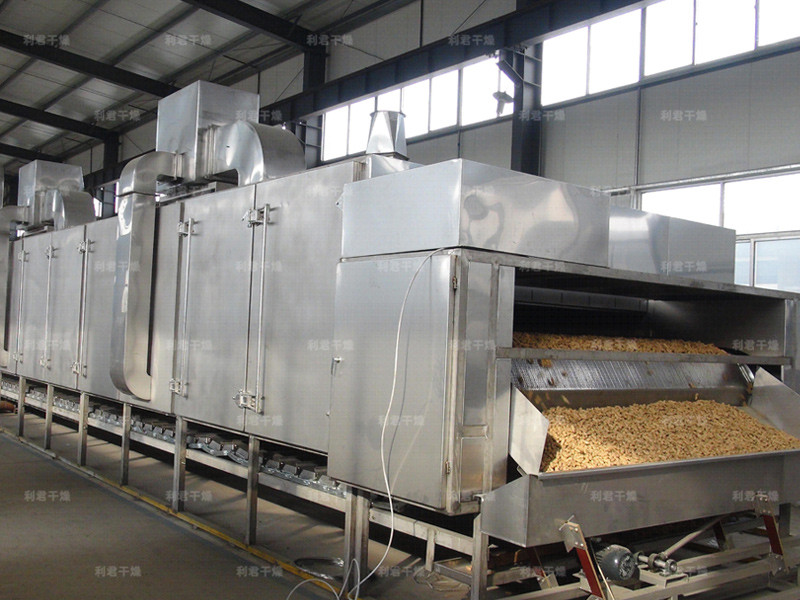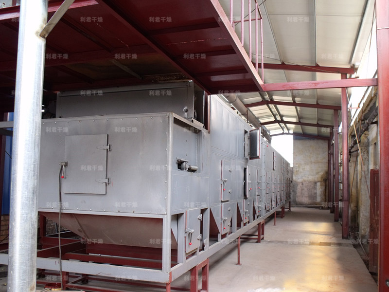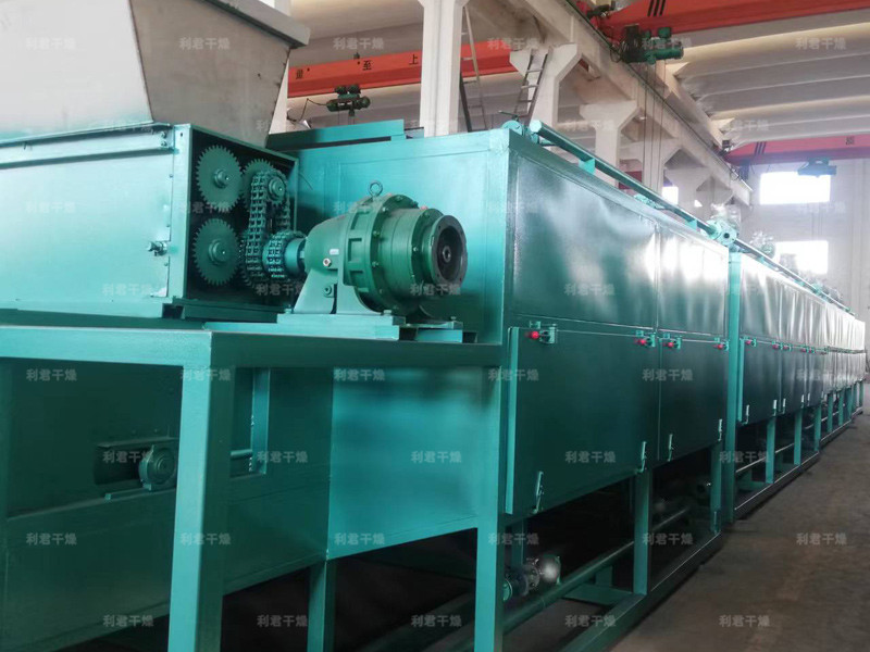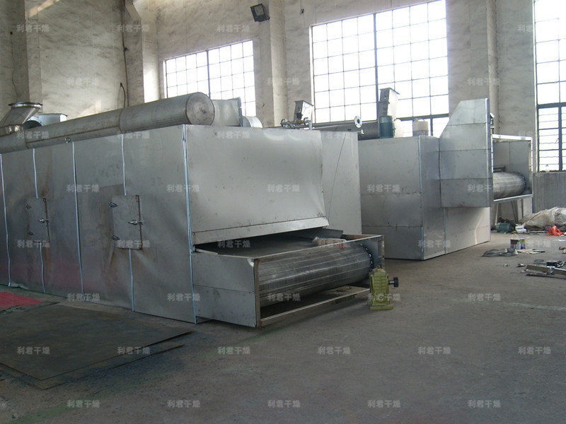 物料由加料器均勻地鋪在網帶上,網帶一般采用12-60目不銹鋼絲網,由傳動裝置拖動在干燥機內移動。干燥機由若干單元組成,每一單元熱風獨立循環,部分尾氣由專門排濕風機排出,廢氣由調節閥控制,熱氣由下往上或由上往下穿過鋪滿物料的網帶完成熱量與質量傳遞的進程,帶走物料水份。網帶緩慢移動,運行速度可根據物料溫度自由調節,干燥后的成品連續落入收料器中。上下循環單元根據用戶需要可靈活配備,單元數量亦可根據需要選取。