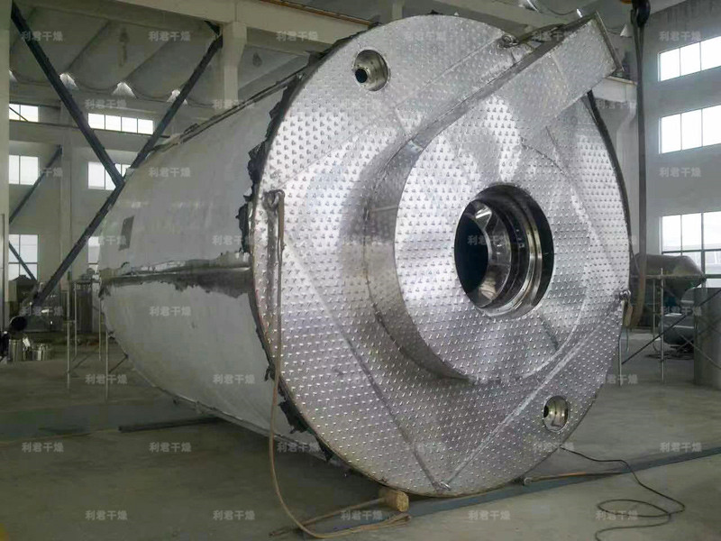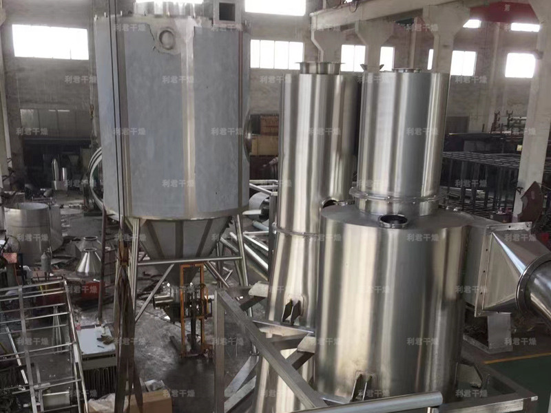 空氣經過濾和加熱,進入干燥器頂部空氣分配器,熱空氣呈螺旋狀均勻地進入干燥室。料液經塔體頂部的高速離心霧化器,(旋轉)噴霧成極細微的霧狀液珠,與熱空氣并流接觸在極短的時間內可干燥為成品。成品連續地由干燥塔底部和旋風分離器中輸出,廢氣由風機排空。